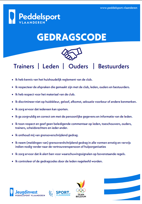 Gedragscode Meer informatie te vinden op de site van Peddelsport Vlaanderen. https://www.peddelsport.vlaanderen/
